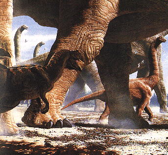 Aufgrund von Fußspuren läßt sich vermuten, daß die großen Sauropoden, hier Apatosaurus, in festen, streng strukturierten Herdenverbänden umherzogen, wobei die Alttiere die Jungtiere schützten.